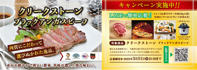 アメリカで最も人気が高いブラックアンガスビーフの専門ブランドであるクリークストーン。ブラックアンガス牛の、ほど良いサシが入った柔らかい肉質と、旨味が続く上質な味わいが楽しめるブランドビーフです。丸紅ミートセレクションでは、2022年3月1日から31日までにかけて、以下のキャンペーンラベルが貼られたクリークストーン・ブラックアンガス・ビーフを流通店舗でお買い上げいただき、所定の条件を満たしてご応募頂いた方を対象にキャンペーンを実施します。詳しくは以下の「キャンペーン概要」をご確認ください。