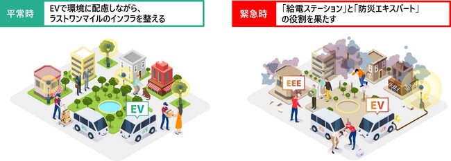 バッテリーに貯めた電力で走るEVの多くは、そのバッテリーから電力を取り出すことができます。平常時にまちなかを走るラストワンマイル配送のEVは、災害などで通常の電力供給が止まった緊急時に、地域の電力供給源に早変わりすることが可能です。