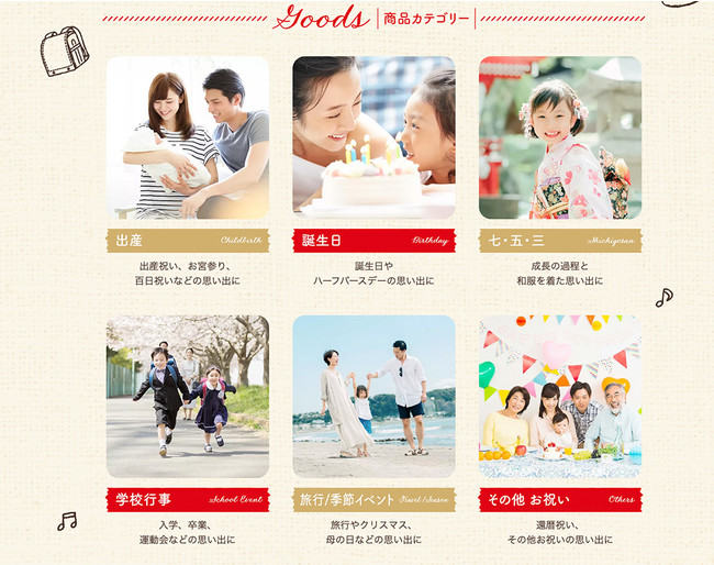 家族向けけのオリジナルグッズのオンラインショップです。ハレの日の記念や思い出をオリジナルグッズとして形に残すお手伝いをします。具体的には、お客様がカメラや携帯で撮影した人物写真を使用して、オケージョンに合わせたオリジナルのグッズが制作できます。出産、誕生日、入学、卒業を祝うギフトとしてもご利用いただけます。