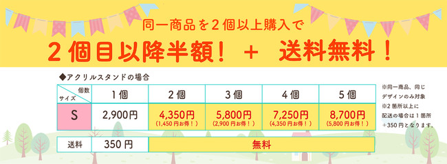 オープンを記念して同一商品を複数お買上いただくと2個目以降の商品価格を半額で提供するキャンペーンを実施中です。(※数量限定。予定数量がなくなり次第終了となります。)