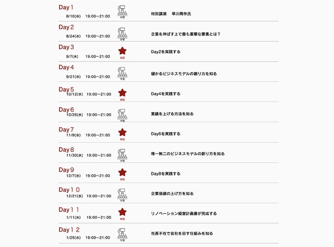 売上に伸び悩んでいる中小企業の既存事業を"リノベーション"することで10億円を超えて成長する企業の仕組みを創り上げる経営手法を学びながら、6ヶ月で自社に合わせたリノベーション経営計画書を実践的に創り上げます。