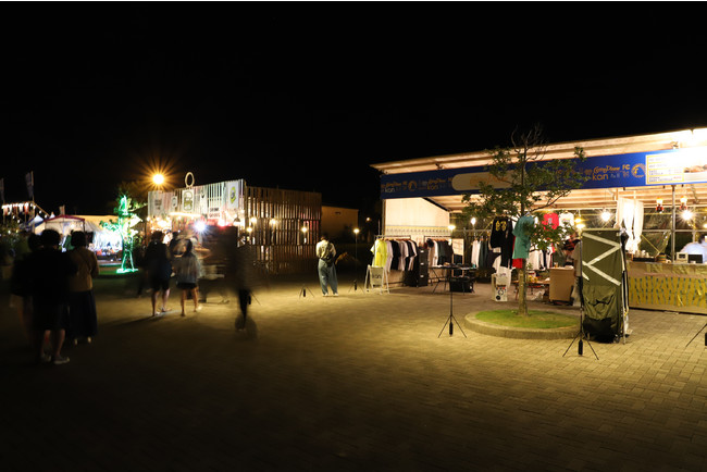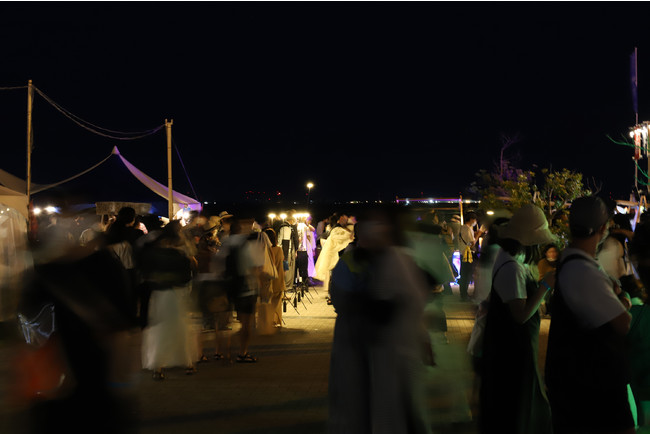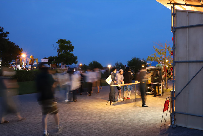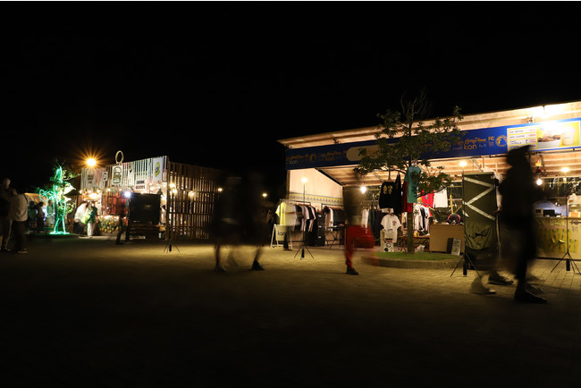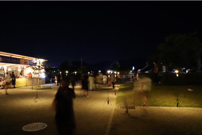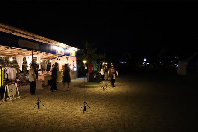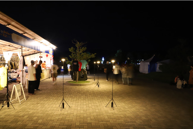 PoleStar Light(R)(ポールスターライト)を等間隔で1列に並べることで、光によるゆるやかな境界線を作りました。ロープを張るよりも視認性が高く、また光源があるため認識もしやすく、夜間のイベントスペースと通路の切り分けを効果的に行うことが可能です。