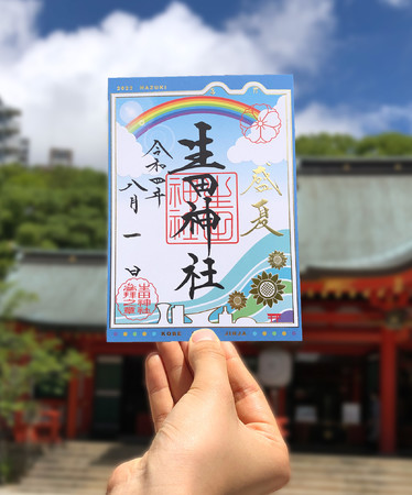 この御朱印は、夏の空に活力豊かに燦々と輝く「朝日」と、その光を浴び色とりどりの表情を見せる「波模様」、幸せな気持ちに誘なう「虹」、煌びやかに輝く夏の花「ひまわり」を神戸の街に配した8月限定の御朱印です。