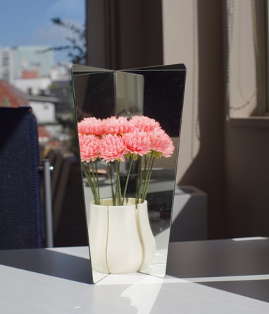 - 「Non Flower-loss Vase」は、少ない本数の花でも華やかに飾ることができる花瓶です。鏡を利用して、花の量を6倍に見せることができます。イベントなど一時的かつ大量に花を飾る場面などで使用する花の量を減らすことができ、フラワーロス軽減にも貢献できます。この花瓶は、今年6月の国際家具見本市ミラノサローネで展示をおこないました。海外バイヤーからの反応を受け、商品化を目指しMakuakeに掲載。TikTokでも約7割の方からほしいと回答していただいております。-