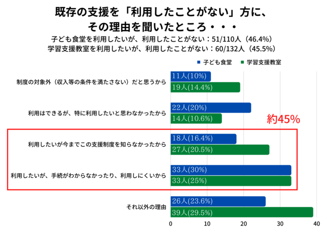 困難を抱える人ほど、必要な支援制度を活用していない現実があります。弊会が実施する食料支援のご利用者様176名(うち94名は世帯年収200万円以下)へのアンケート調査で、「制度の存在自体を知らなかったり、手続きの仕方が分からない」ことで、支援制度を利用したいと考えているにも関わらず、活用できていない方が4割にものぼることが明らかになりました。