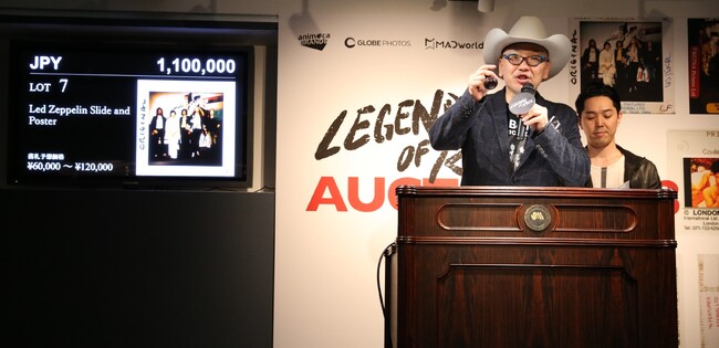 選りすぐりの10枚の貴重なスライドを用いたオークションの手に汗握る展開は、ライブビッドで生中継され、世界中が注目する中、オンラインと現地入札による激しい競りが行われ、最終的にはLed Zeppelinの伝説的なビンテージ写真が110万円で落札される結果となりました。
