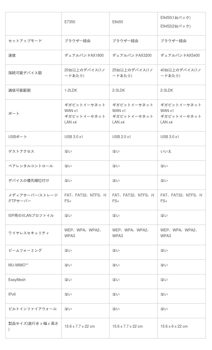 ■ WiFi6 EasyMesh Eシリーズ比較表