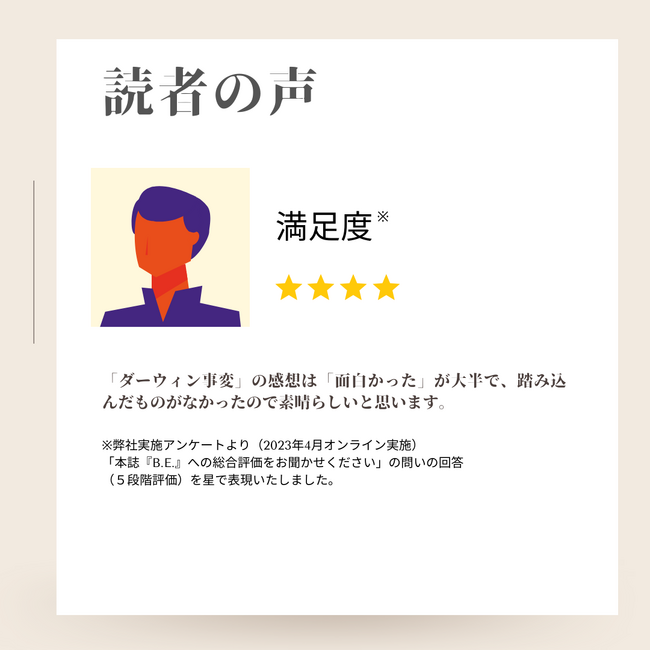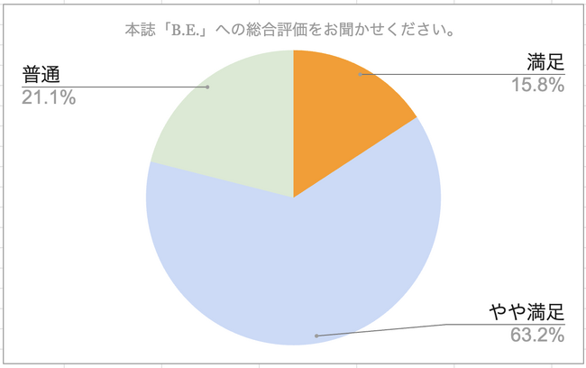 この度、B.E.春号の読者に対してアンケートを実施いたしましたので、内容をご紹介させていただきます。是非、今度購入をご検討される際の判断材料としていただけますと幸いです。