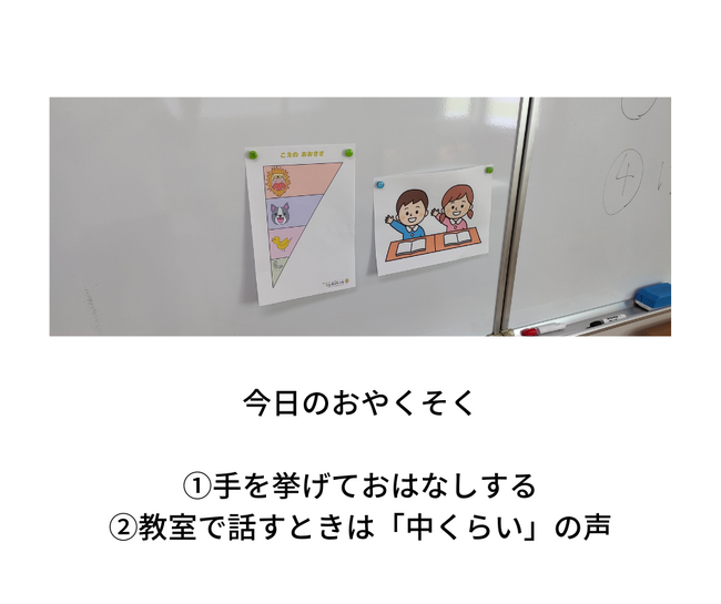 1回の授業は約60分です。前半は「お話」「日付の確認」「教室ルールの確認」などを行い、前半は「微細運動」(運筆・はさみ・のり・そのほか文房具など)を行い、後半は身体を動かした「粗大運動」(ゲームなど)を行う。発達に特性があるお子様でも飽きずに取り組めるように工夫されている。