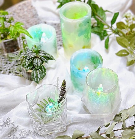 フラワーキャンドル作家、Miyako Candleさんの作品とコラボレーションし、キャンドルカバーとMyAurora ジュエリーライトの、夏先駆け、涼を呼ぶアイテムを販売させていただきます。