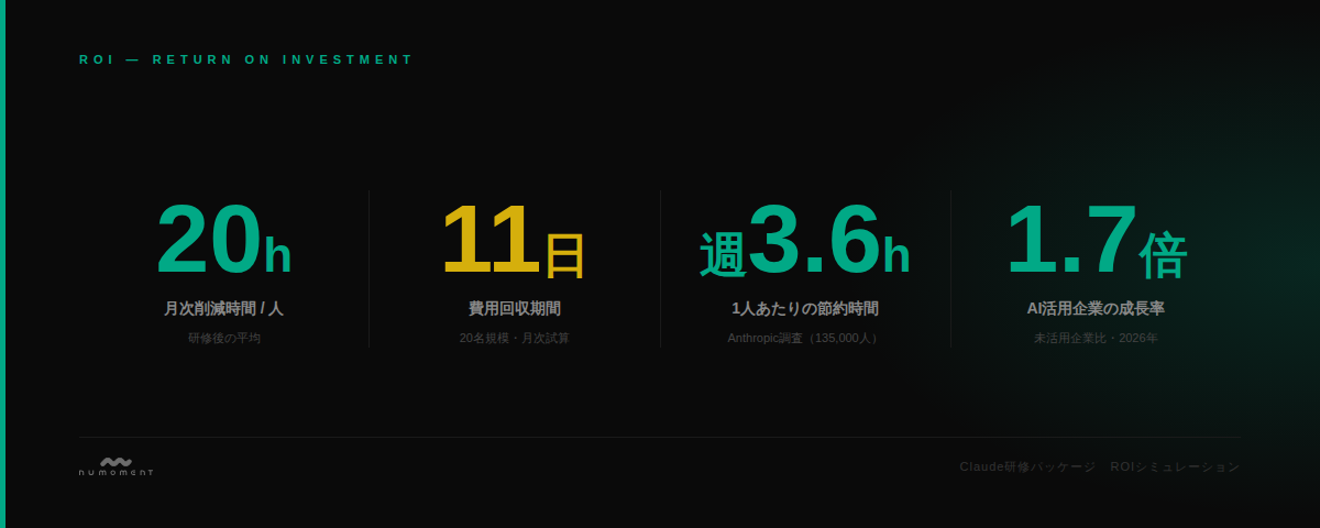 - 研修後の月次削減時間は平均20h/人(社内試算)。20名規模の費用回収期間はわずか11日間