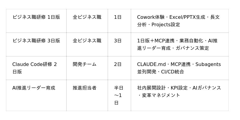 - ビジネス職1日版・3日版、Claude Codeエンジニア研修2日版、AI推進リーダー育成