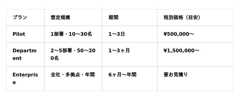 - Pilotプランは¥500,000〜、1〜3日間の短期実施で効果測定レポートを提供