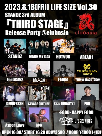 そして、このリリースを記念して、2023年8月18日(金)には東京・SHIBUYA Club Asiaでリリースパーティー『LIFE SIZE vol.30』が開催されます。STANDZをはじめ、輪入道、Felipe、MAKE MY DAY、DEVDFRE$H、AREA81、HOTVOX、YELLOW BLACK TOKYO、FOOLiGANS、SAVAGE CULTUREといった超豪華アーティストが出演し、盛大にアルバムのリリースを祝います。
