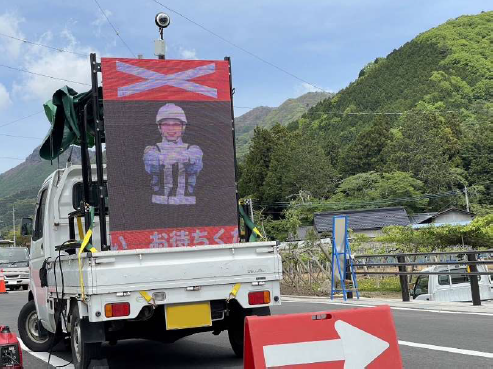 人手不足を解消すべく、道路工事現場においてAIが警備員に代わって交通誘導を行うデモンストレーションを