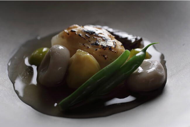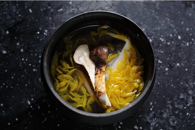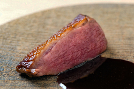 鴨は通年但馬鴨を。秋のジビエシーズンには網取りの尾長鴨を採用する。オーブンで休ませながらゆっくりと火入れし、炭火で香ばしく仕上げしっとりとしたロゼ色に。鴨のガラと香味野菜、ダックファットがブレンドされた深みある濃厚な汁に漬け手繰っていただきたい。