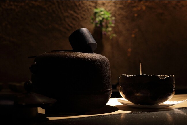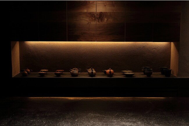 研ぎ出しや土壁、漆喰、美濃和紙、漆など、日本が誇る伝統工芸や左官技術で構成。うつわも全て選りすぐりの現代作家達がオートクチュールで作陶したもの。
