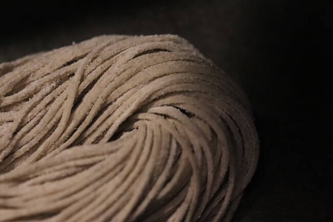喉越しや細さ、長さ、艶、緑色など、これまでの蕎麦の良しとされる概念だけではなく、日本酒とペアリングすることを念頭に置き、味や香り、つまりミネラルを感じる蕎麦打ちにフォーカスしています。栃木や茨城、長崎、鹿児島などの丸抜き・玄をブレンド。秋のシーズンでは、福井や北海道、神戸三田の蕎麦を採用し、電動石臼と手挽きを使い分け自家製粉する。