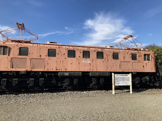 韮崎駅から徒歩30分の韮崎中央公園に『電気機関車EF15』が保存されています。これは、1986年に旧国鉄より貸与されたもので、『EF15形式198号車』のほか、貨車「トラ」や車掌車「ヨ」を含む5両連結という、日本全国を見ても珍しい状態で今もなお当時のまま保存されています。