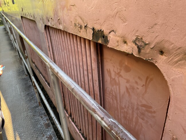 表面の塗装が剥がれ、一部の部品が消失。穴が開いている箇所や錆が出ている状態。色彩も当時の面影はなく別の色に。