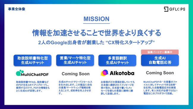 株式会社GFLOPS(本社:東京都渋谷区、代表取締役社長:盛本マリア、共同代表:鈴木亮祐、以下GFLOPS:ジーフロップス)は、『情報を加速させることで世界をより良くする』ことをミッションに設立されました。BardやChatGPTを代表とする生成AI等の技術を活用することで、カスタマーエクスペリエンスの最大化を目指し、人とAIが分業することで実現できるソリューションをグローバル展開します。