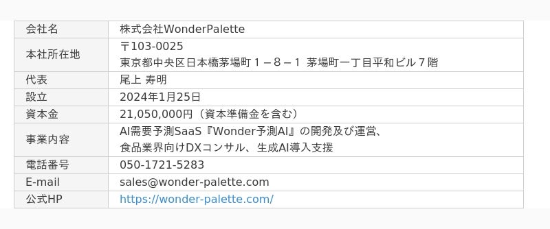 AI需要予測SaaS『Wonder予測AI』を開発する株式会社WonderPalette(本社:東京都中央区、代表取締役:尾上寿明)は、シードラウンドにて2,100万円の第三者割当増資を実施しました。この資金調達により『Wonder予測AI』の開発推進と組織拡大を加速し、食品業界のDXとAI活用を推進します。当社は、「食品廃棄ゼロ」を目指し、食品業界の利益率向上と日本の食品廃棄問題の解決に取り組んでいます。