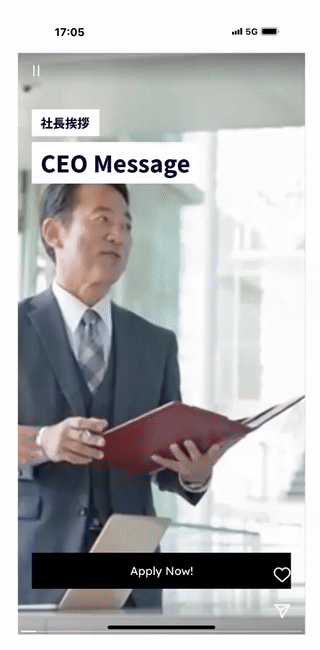 サンプル(ストーリー形式)ストーリー形式では、動画だけでなく画像やアニメーションを使ってコンテンツを作成できます。リンクボタンやアンケートなど、さまざまなインタラクションを使って、視聴者とのエンゲージメントを深めることができます。またストーリーが1つのウェブページとしてインデックスされるため、SEOにも有効です。
