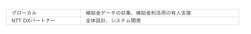 そこで、補助金を利活用する企業とそれを支援する機関の「情報収集・選定」「申請」における課題を解決するべく、グローカルとNTT DXパートナーは、お互いの強みを組み合わせた補助金活用支援サービスを開発することとしました。