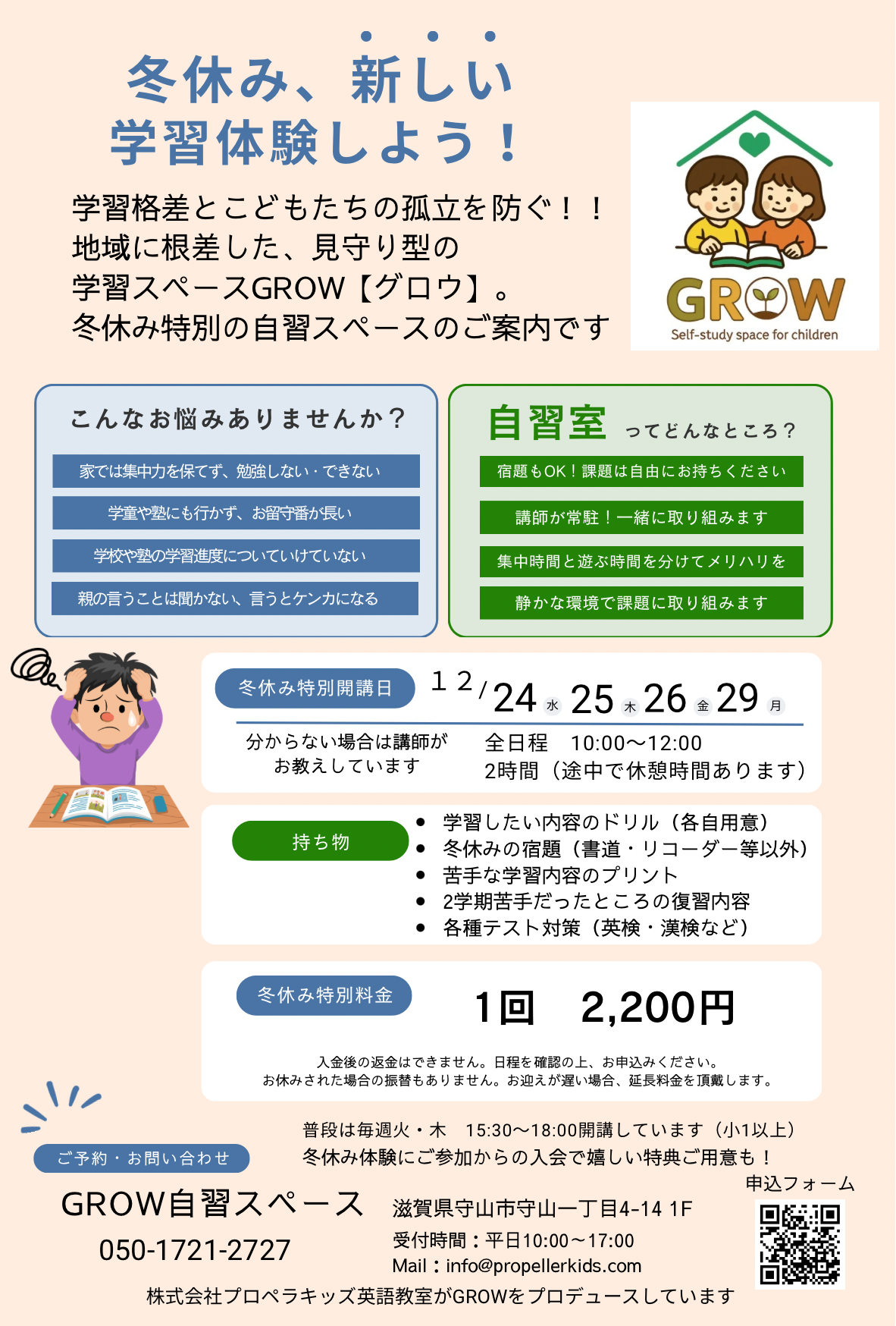 株式会社プロペラキッズ(滋賀県守山市)は、11月にオープンした見守り型自習スペース「GROW(グロウ)」にて自習スペース体験会を冬休みの2025年12月24・25・26・29日の4日間開催します。