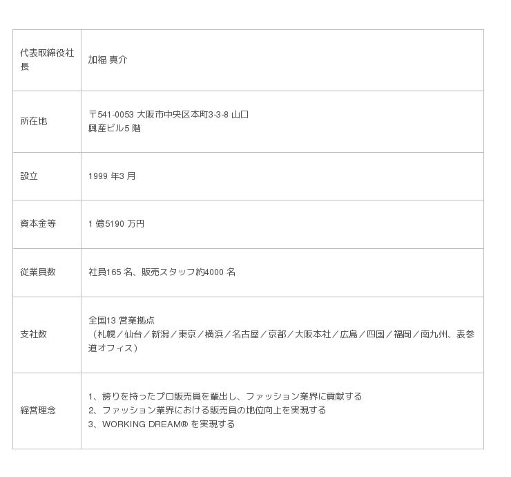 1999 年3 月に設立した、アパレル・ファッション・コスメ業界の販売職に特化したプロフェッショナルカンパニー。業界スペシャリティとして唯一47 都道府県を網羅し、キメ細やかなサービスを提供、独自の地位を築いてきました。ファッション・コスメ業界の数多くの著名ブランドの人材パートナーとして、1500 社以上の取引先企業からの支持を得ており、人材紹介・人材派遣・教育・店舗運営・出店コンサルティング等を行っています。