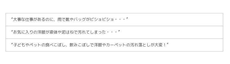 雨やシミ、汚れから大切なモノ、お気に入りのモノを守りたいときに。