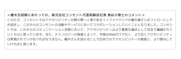 株式会社コンセント(本社:東京都渋谷区、代表取締役社長:長谷川敦士、以下「コンセント」)は、アクセシビリティの専門家である株式会社インフォアクシア 代表取締役の植木真氏を、社外フェローとして招聘いたします。