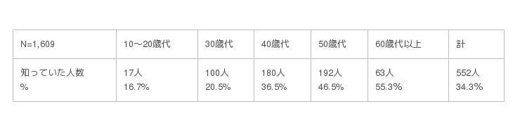 「知っていた」34,3%、「知らなかった」65,7%との回答だった(図1)。「知っていた」と回答した人の年代別人数(表2)と年代別割合(図2)に示す。