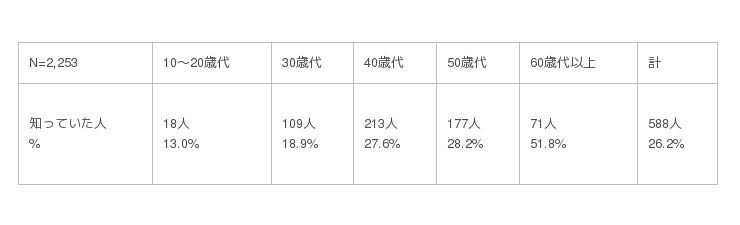 「知っていた」26,0%、「知らなかった」73,9%との回答だった(図3)。「知っていた」と回答した人の年代別人数(表4)と年代別割合(図4)を示す。