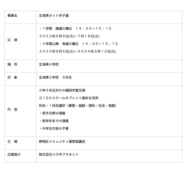 岬地区コミュニティ運営協議会(福岡県宗像市、以下岬コミュニティ)は、地域の子どもたちの学力向上を目指す取り組みとして、市内の小学校及び宗像市と協働して放課後学習支援「玄海東ネット寺子屋」を開始しました。学力向上のために、ICTを活用して児童一人ひとりに合った個別学習ノウハウや学習支援者育成プログラムを提供する株式会社コラボプラネット(以下コラボプラネット)と連携し、地域の少ないリソースの中でも持続可能で、効果的な学習支援を実施します。