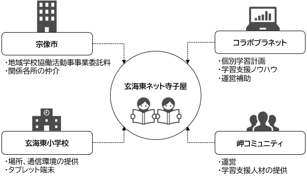 宗像市では、学校・家庭・地域が一丸となって子どもの成長を支えていく社会総がかりの教育(小中一貫コミュニティ・スクールと地域学校協働活動の一体的推進)を目指しています。その象徴的な取組の一つが、玄海東ネット寺小屋です。玄海東ネット寺小屋は、学園運営協議会において学校・家庭・地域で共有した課題「学力保障」の解決に向けて、地域が主体となり学校と連携・協働して取り組んでいる活動(地域学校協働活動)です。活動の運営には、主に、コミュニティ運営協議会関係者や元保護者、高齢者など多様な地域住民が携わっています。学習に使用するICTを活用した教材の提供については、居住地域における学力格差の解消に関して実績のある企業が携わっています。また、学校も、活動の計画段階から参加し、活動に参加する子どもたちへの奨励や活動場所の提供を行うなど、積極的に関わっています。