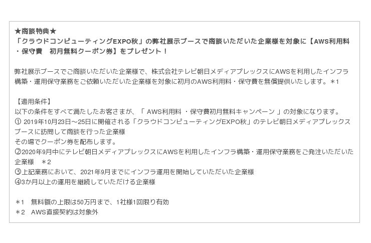 テレビ朝日メディアプレックス、AWSを利用したクラウド構築・クラウド移行サービスを「 クラウドコンピューティングEXPO 【秋】」に出展します。