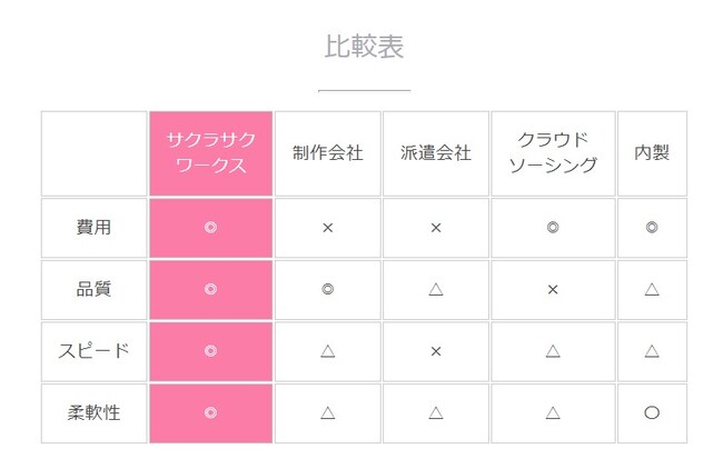 『サクラサクワークスfor biz』の最大の特徴は、企業(貴社)対 企業(サクラサクマーケティング株式会社)の取引であることです。貴社専任のディレクター(サクラサクマーケティング株式会社のスタッフ)が企業対個人に発生するトラブルや手間を全て吸収します。 専任ディレクターとのコミュニケーションのみで全て業務を進行させることができる点が、通常のクラウドソーシングサービスと最も異なる点です。