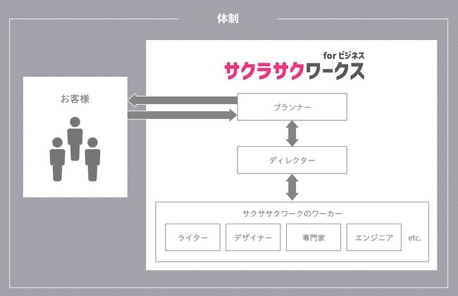 この企業側、ワーカー側のアンバランスな状況に着目して、誕生したサービスが『サクラサクワークスfor biz』です。 全国の優秀なワーカーの力を専任ディレクターが集結、管理、活用することで企業側のリソース・スキル不足を解消し、“攻め”の施策を実行できる体制を一緒に構築できるようになります。