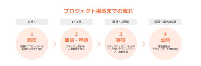 プロジェクトの起案から公開(掲載)までの流れに関して、まず掲載希望のプロジェクトの内容を検討頂いた後に弊社スタッフと面談を行います。そして必要書類の提出及びプロジェクトページの作成・審査を終えた後にプロジェクトの公開となります。プロジェクトの起案から公開までは、約1ヶ月かかります。