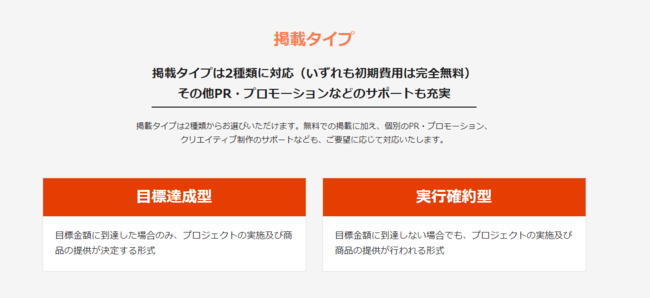 FANDRAISEでクラウドファンディングのプロジェクトを掲載する際、プロジェクトの起案者は「目標達成型」と「実行確約型」の2種類から掲載方式を選択する必要があります。「目標達成型」とは、目標金額に到達した場合のみプロジェクトの実施及び商品の提供が決定する形式で、「実行確約型」とは、目標金額に到達しない場合でもプロジェクトの実施及び商品の提供が行われる形式を指します。