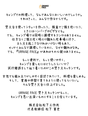 株式会社松下工作所(大阪府東大阪市、代表取締役:松下寛史)は新アウトドアブランド【ORANGE FACE】製品第一弾として焚き火キッチンを2022年3月10日(木)17:30よりクラウドファンディングMakuakeにて開始いたします。