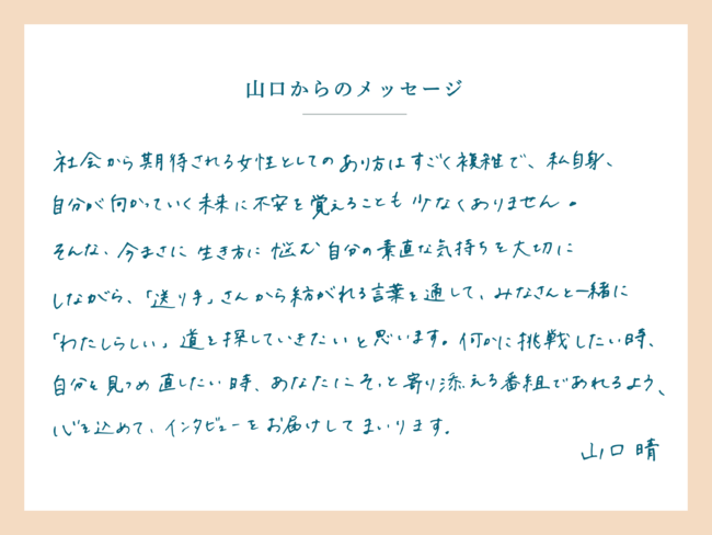 社会から期待される女性としてのあり方はすごく複雑で、 私自身、自分が向かっていく未来に不安を覚えることも少なくありません。そんな、今まさに生き方に悩む自分の素直な気持ちを大切にしながら、「送り手」さんから紡がれる言葉を通して、みなさんと一緒に「わたしらしい」道を探していきたいと思います。何かに挑戦したい時、自分を見つめ直したい時、あなたにそっと寄り添える番組であれるよう、心を込めてインタビューをお届けしてまいります。