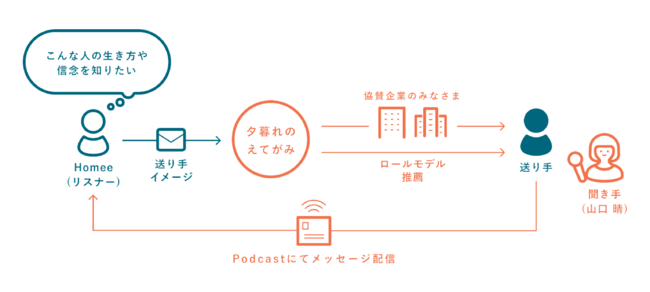 「夕暮れのえてがみ」は、Homee(リスナー)の「こんな人と出会いたい」を実現する番組です。「送り手」(ゲスト)は、「Homee」からのリクエストを元にオファーさせていただきます。リクエストは、個人名だけではなくイメージだけでも可能です。イメージをもとに合致する方を「夕暮れのえてがみ」がオファーさせていただきます。リクエストは、公式LINE( https://lin.ee/dFok780 )のポストマークから受け付けております。
