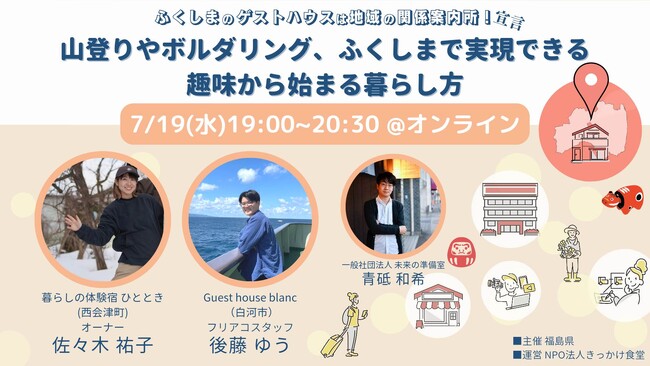 特定非営利活動法人きっかけ食堂(所在地:東京都中央区)は、福島県からの委託を受け、一般社団法人未来の準備室(所在地:福島県白河市)と協力し、関係人口創出・拡大及び移住促進を目的に、オンラインセミナーを実施いたします。