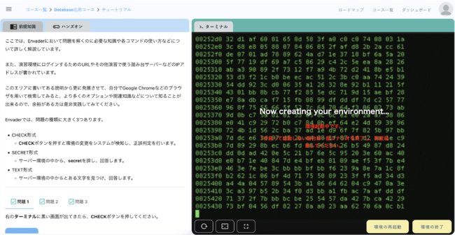 Envader(エンベーダー)は、Linux・サイバーセキュリティ・データベースなどを学べるインフラエンジニアの学習に特化したサイトです。「ワンクリック、5秒」で各ユーザーに、固有な仮想環境を作成することで、ユーザーは自由に黒い画面(ターミナル)を触ることができます。