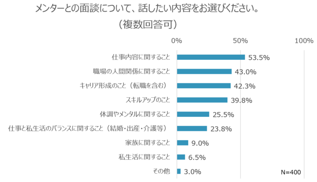 その他、メンターとの面談で話したい内容として、目の前の仕事や人間関係に加え、キャリア形成やスキルアップなど将来を見据えた相談が挙がっていました。また、4人に一人は体調・メンタルや、仕事と私生活のバランスに関することを話したいと回答しており、メンターは制度利用者の心と体の健康に目を配れることも重要になってきています。