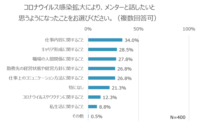 コロナ禍でメンターと話したいと思うようになったことを尋ねたところ、4人に一人が会社の経営状態・方針やコミュニケーション方法を選択しました。自分の仕事やキャリアに影響が及ぶことへの不安や、コミュニケーションスタイルの変化に対する戸惑いがあることがうかがえました。