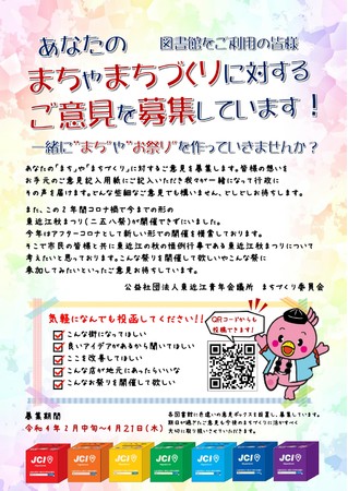 公益社団法人東近江青年会議所がまちづくり事業の一つとして市内7カ所の図書館に意見ボックスを設置し、市民の皆様に「まちづくり」へのご意見を募集します。