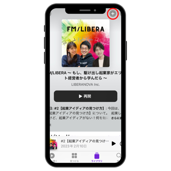 「サブスクリプションに登録」をタップして登録しておくと、「ライブラリ」からいつでも簡単にアクセスができるようになります。また、新着エピソードのお知らせをプッシュ通知で受け取ることができるようになります。エピソードの右上にある「+」ボタンをタップしておくとエピソードの新着通知が届きます。